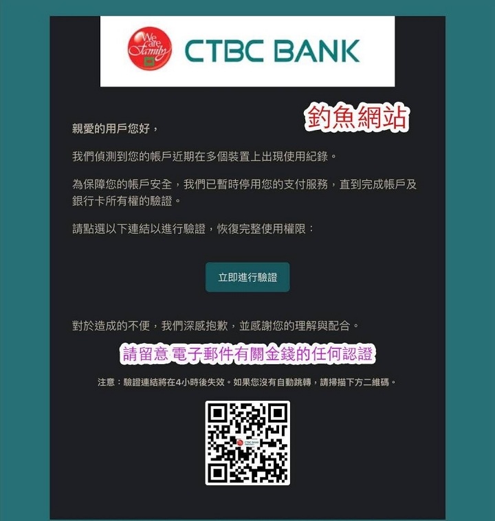 類似的詐騙手法已於7月開始流竄,中信銀日前表示,接獲外界反映有不肖人士偽冒中國信託銀行名義,發送社群媒體訊息或電子郵件,通知客戶交易驗證,引導輸入網銀帳號密碼,抑或宣稱偵測到帳戶在多個裝置出現使用紀錄,要求點擊內附連結進行驗證,恢復完整使用權限。