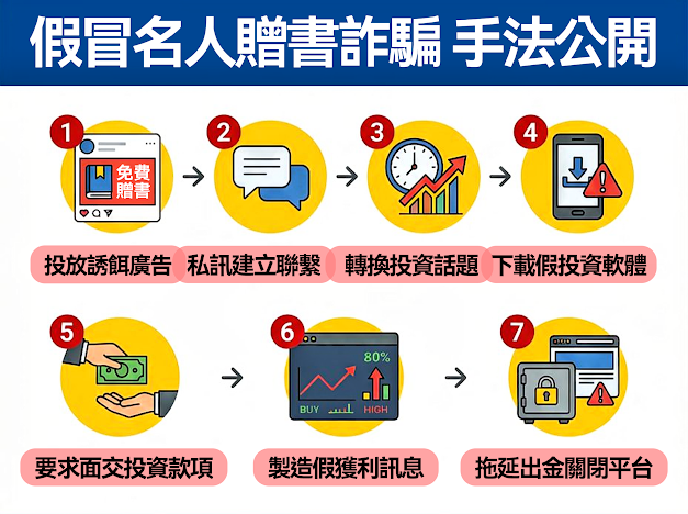 刑事局日前指出北部一名退休女子,誤信社群平上的「名人免費贈書」廣告,原本只想領取台積電創辦人張忠謀的自傳,卻在加入通訊軟體LINE群組後,落入詐騙圈套。詐騙集團以投資「養老院開發計畫」為名,聲稱保證獲利、穩賺不賠,誘導女子下載「假投資APP」還多次面交現金,最終損失高達1200多萬元。