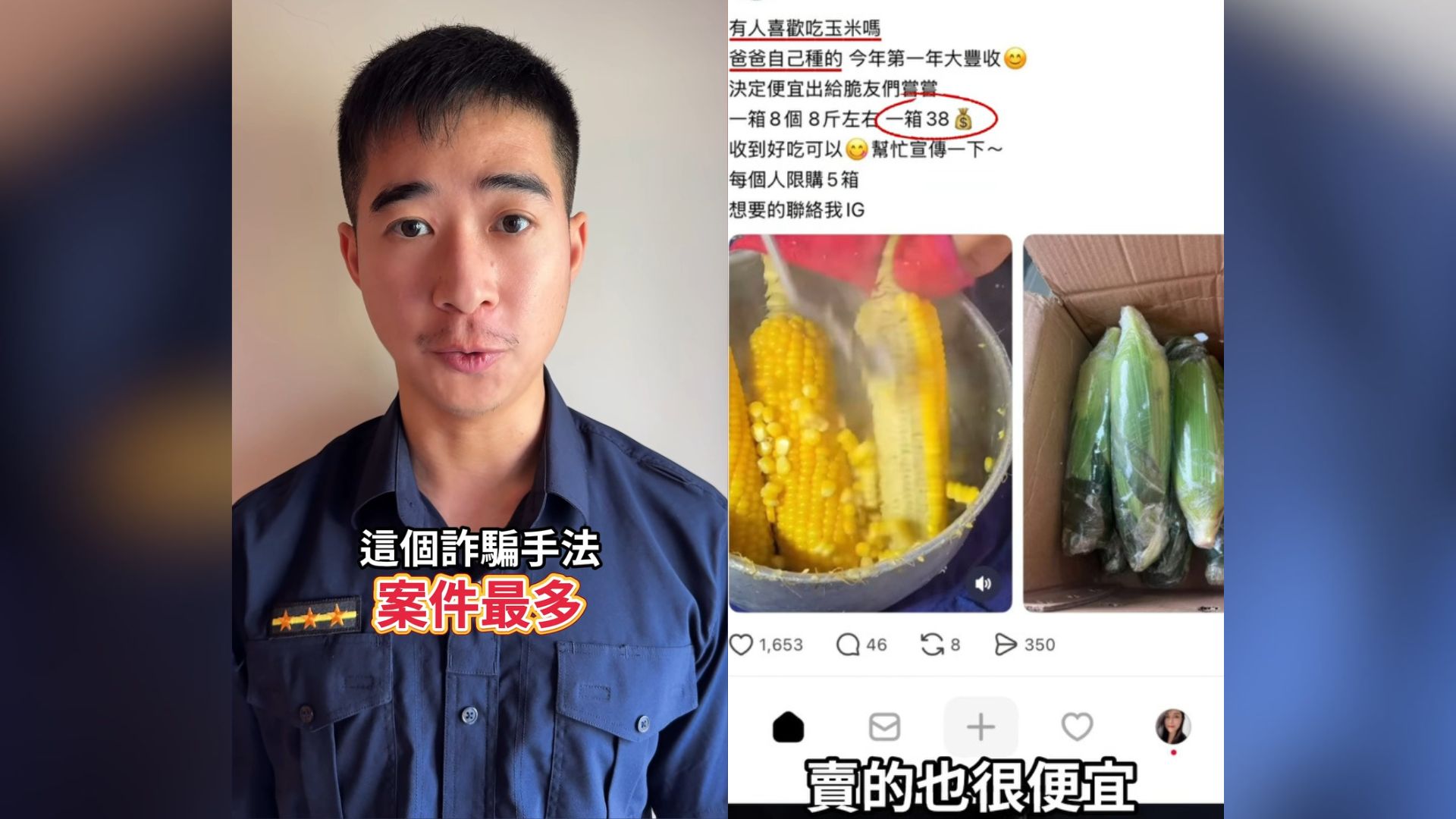165全民防騙指出,最近有人在社群平台Threads上看到販售自家種植玉米的貼文,價格低廉且按讚數高,因而私訊下單。未料,依指示填寫訂單資料後,對方卻聲稱「未完成實名認證」,導致訂單遭凍結,甚至以報警威脅施壓。