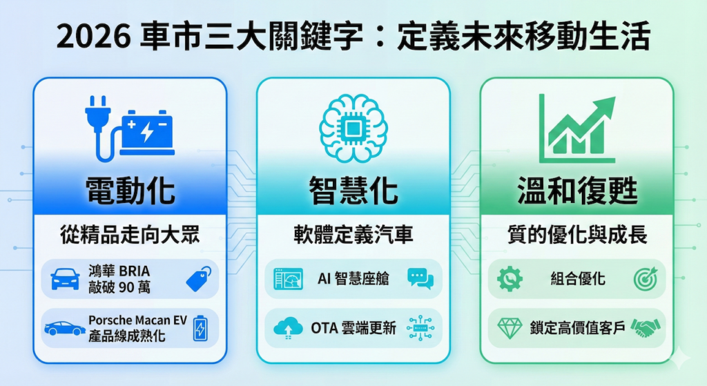 這種「溫和復甦」的底氣來自於三個層面。首先,是政策與法規的明朗化。裕日車總經理姚振祥指出,經歷了2025年的調整期,不確定因素正逐漸消散,且進口車與美規車的規畫也逐步落實;其次,是「汰舊換新補助」紅利的持續發酵,支撐了廣大的基層換車剛需;最後則是車展帶動的強大「話題紅利」,各車廠趁勢加碼的促銷方案,成功點燃了跨年檔期的購買慾望。 對車商而言,這5%的成長不僅是銷量的提升,更是「質」的優化。現代汽車(Hyundai)總代理南陽實業表示,將透過「季季有新車」的攻勢,衝刺市占目標。看來,各廠牌均把握市場回溫契機,透過優化產品組合(Portfolio Optimization)來鎖定高價值客戶,這也預告2026年的車市將迎來穩健復甦。