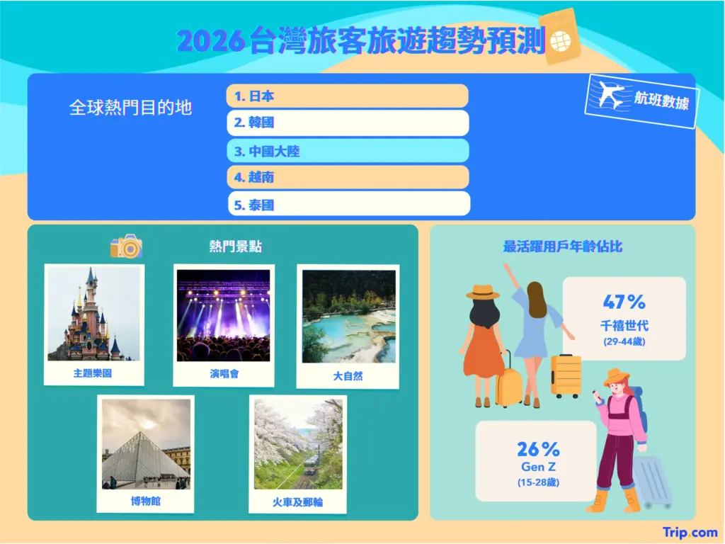 旅遊平台Trip.com最新發布的《台灣旅遊趨勢報告》,數據顯示,2025年出境旅遊市場持續回溫,整體呈現「短程化」、「年輕化」與「體驗導向」三大關鍵趨勢,展望2026年,體驗式旅遊將成為市場的主流區動力。