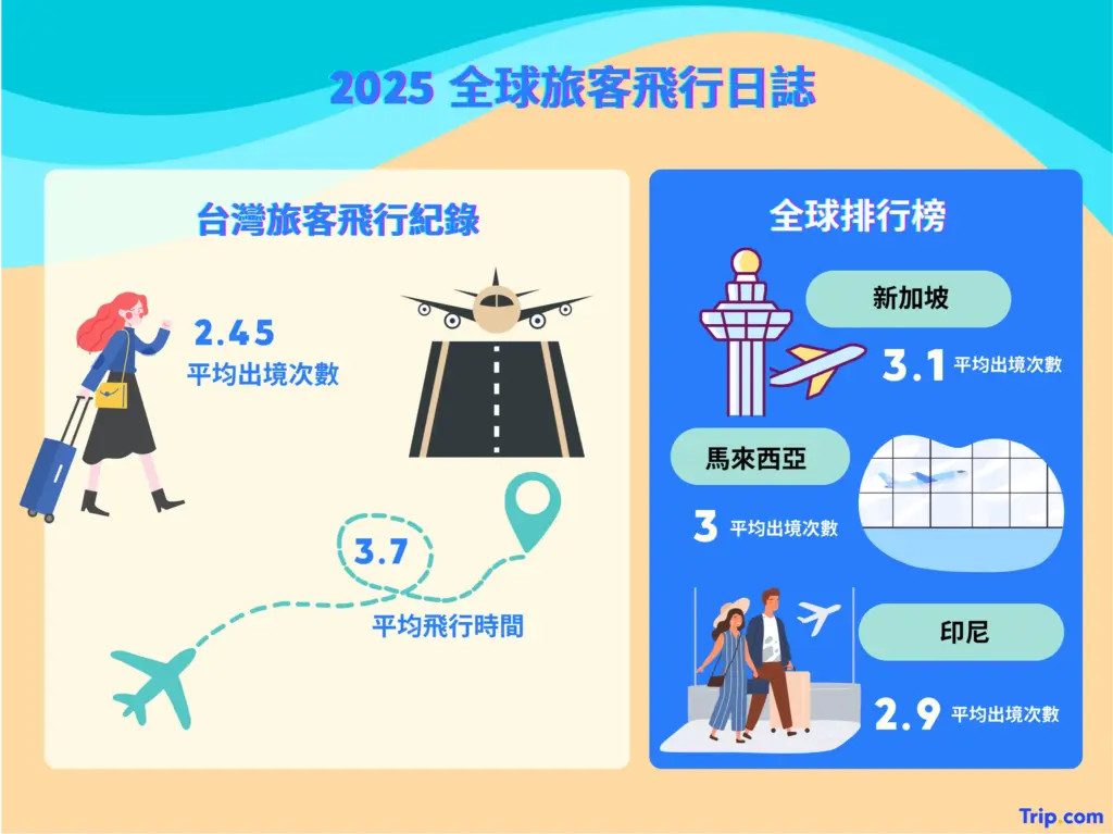 你去年出國幾次?根據調查,2025年台灣平均每人出境2.45次,高於日本、韓國,也與亞洲旅遊成熟市場如新加坡和香港相去不遠,台灣人出國的熱情正處於前所未有的高峰。