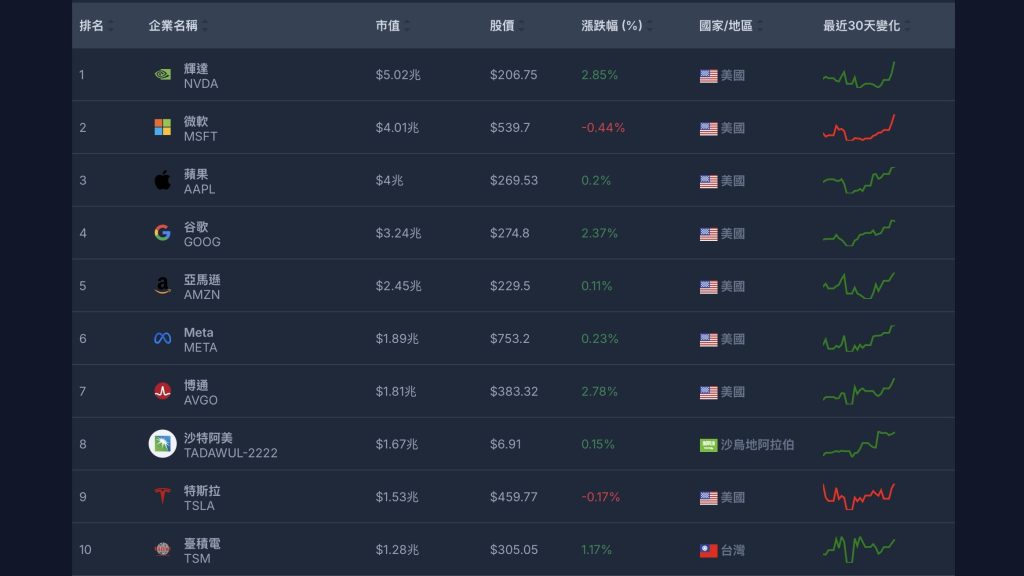 回到各別公司的市值戰場仍有亮點,台積電以1.28兆美元,居全球第10大公司。至於第2至9名,分別是微軟的4.01兆美元、蘋果3.99兆美元、Alphabet 3.24兆美元、亞馬遜2.44兆美元、Meta 1.88兆美元、博通1.8兆美元、沙烏地阿美1.67兆美元、特斯拉1.54兆美元。