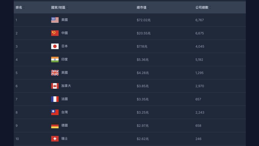 根據MarketCapWatch指出,放眼全球89國資本市場,黃仁勳的「AI王國」以市值5.02兆美元,狠踩英國總市值4.28兆美元,躍為全球第5大市場,僅4個國家贏黃仁勳,分別是美國的72.04兆元、中國20.55兆元、日本7.18兆元、印度5.36兆元,而台灣以3.25兆元排第8。