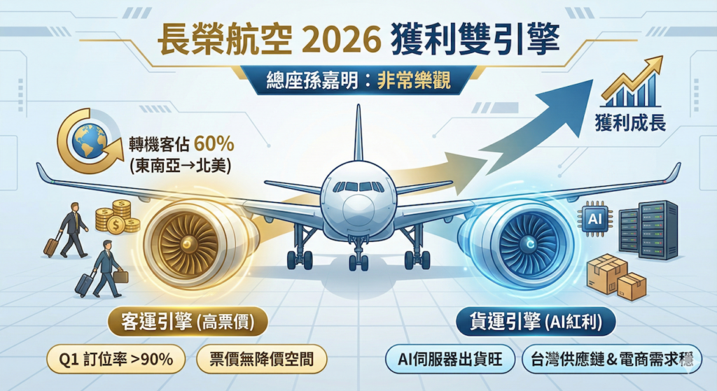 長榮航空繼2025年繳出歷史次高的亮麗營收後,市場原先擔憂在高基期與新機產能開出的雙重壓力下,2026 年成長動能恐將放緩,然而,在12日的媒體茶敘上,總經理孫嘉明以一句「非常樂觀」,掃除了投資人的疑慮。究竟支撐長榮航股價與獲利的底氣為何?拆解其營運結構,可發現「供需失衡的高票價」與「台灣獨有的AI貨運紅利」是兩大關鍵支柱。