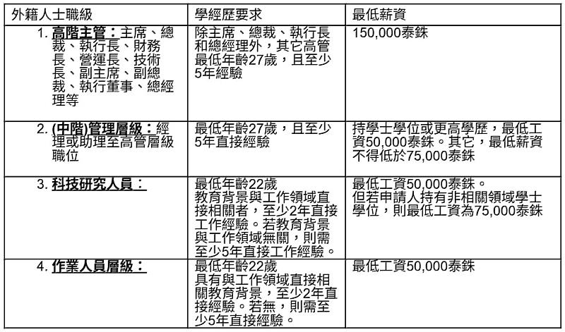 第三,BOI給予外籍人士工作簽證一次性批准最多2年。延期申請時,除檢視泰籍員工占比是否合乎規範,同時觀察企業業務擴展、流程改進與勞動力比例,也會持續要求企業降低外籍作業員聘用占比。