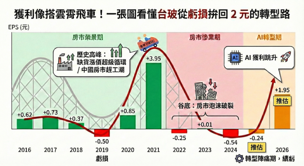 當市場還沉浸在台玻切入輝達供應鏈、股價爆量創高的狂歡派對時,若投資人攤開財報,將看見另一幅截然不同的景象。雖然董事長林伯豐喊出AI轉型的豪語,但數字不會騙人,根據法人圈流出的最新報告顯示,即便台玻靠著玻璃纖維技術搭上AI列車,但受到中國房市崩盤拖累,這家老牌大廠極可能面臨「連續四年發不出股利」的窘境。