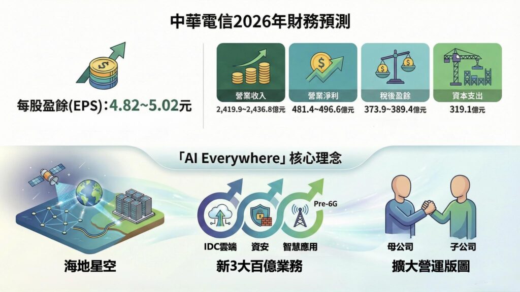 中華電信預測2026年營收達2,419.9億元至2,436.8億元,年增2.5%至3.2%,受惠行動通信、寬頻接取及數據網路等核心業務擴張,並積極爭取AI賦能、數位韌性與永續相關的新資通訊商機。