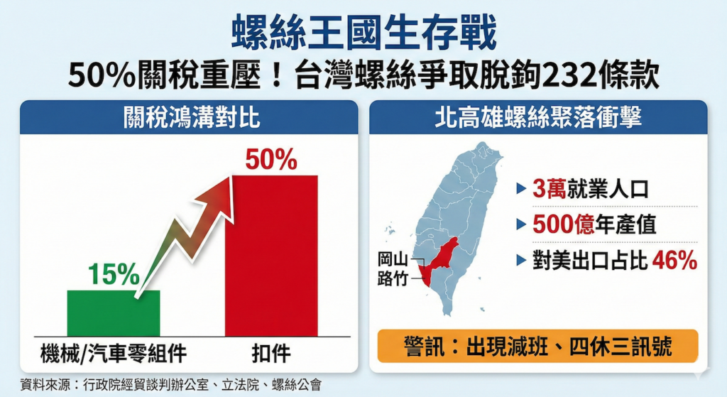 清晨的高雄岡山與路竹,鋼材冷鍛與敲擊聲交織出台灣經濟最規律的脈搏。這具被譽為「工業之米」的扣件產業,不僅支撐北高雄逾3萬名就業人口,更串聯起500億元的年產值;然而,這股轉動世界的動能,如今正受制於台美經貿談判的高牆。當機械、工具機、汽車零組件紛傳關稅降至15%的捷報時,出口對美占比接近46%的螺絲業,卻仍深陷高達50%的232條款課稅枷鎖中。
