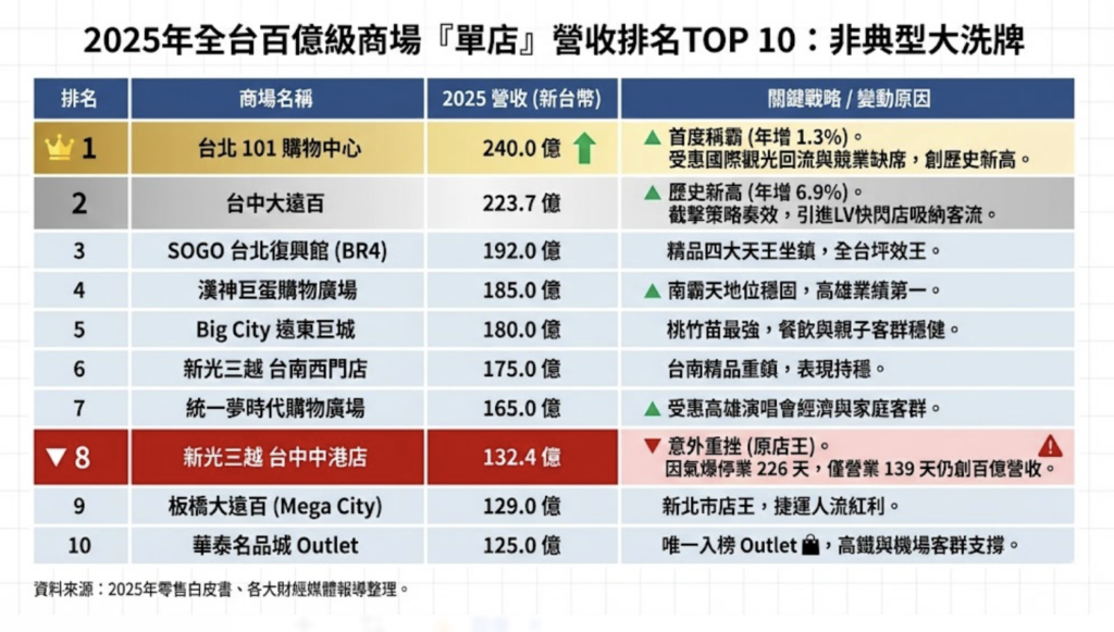 整體來看,2025 年的單店排名,台北101雖靠著時勢奪冠,但已積極透過攀岩等話題布局2026年的衛冕戰;而新光三越的韌性與大遠百的截擊,則證明了經營者的應變能力才是變局中的生存法則。隨著名品旗艦店改裝陸續完成,2026 年的「百億俱樂部」競爭勢必將從「意外戰」回歸到「實力戰」。