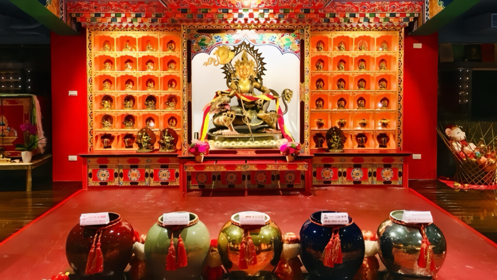 一樓有緬甸側臥玉佛,並在中央供奉泰國四面佛;2樓為「財寶宮殿」,供奉四大天王之一、職司北方的守護神「多聞天王」,也就是「財寶天王」。祂職掌濟度眾生的功德利益、散佈財富,與綠、白、紅、黃、黑等五姓財神都是藏傳佛教中的重要財神;財寶天王壇城對面也設有五姓財神祈願缸,讓大眾祈願;黃財神主增長福德,紅財神主所求願滿,綠財神主事業圓滿,黑財神主去除無明,白財神主去除病苦。