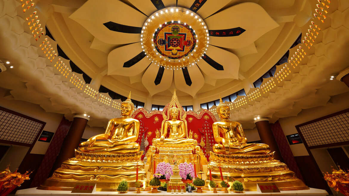 靈鷲山道場中的聖山寺,大殿內坐著高聳的三金佛,分別是中間的「成功佛」,以及左右的「平安佛」與「圓滿佛」。「泰國商人拜成功佛,祈求事業成功、生意興隆,非常靈驗。」陳進財說。