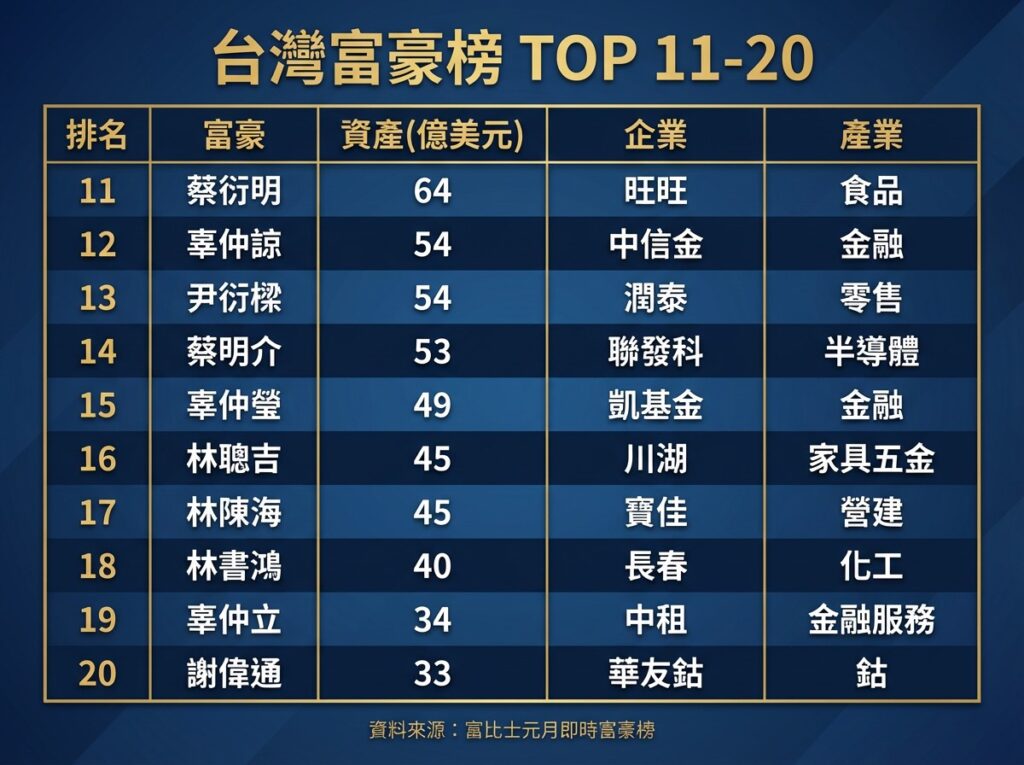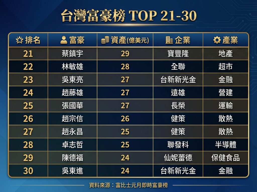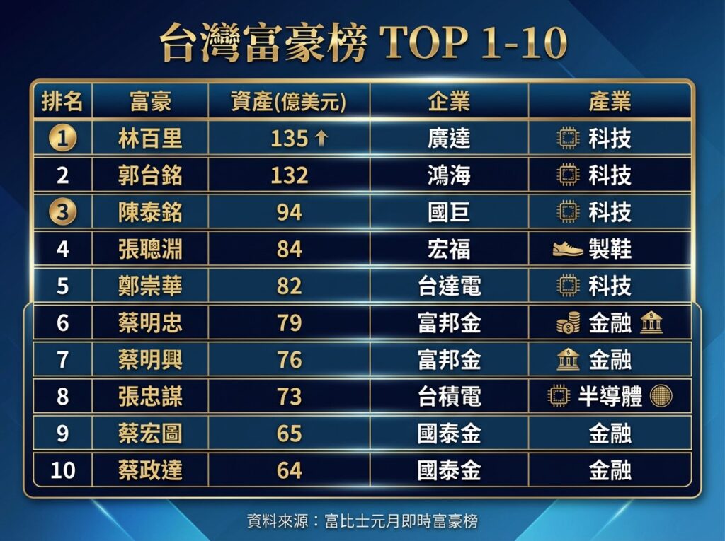相比AI大熱的金融業和傳產,雖然沒有搭上AI浪潮,但表現也不遜色,曾任首富的鞋王張聰淵以84億元拿下第四,金融業則以富邦蔡家兄弟表現最搶眼,分別以79億美元、76億美元各拿下第六、第七名,若以去年《富比士》公布台灣50富豪榜,兩人合計總資產計算,兩人合計高達155億美元,直接打敗科技巨頭林百里、郭台銘、陳泰銘。