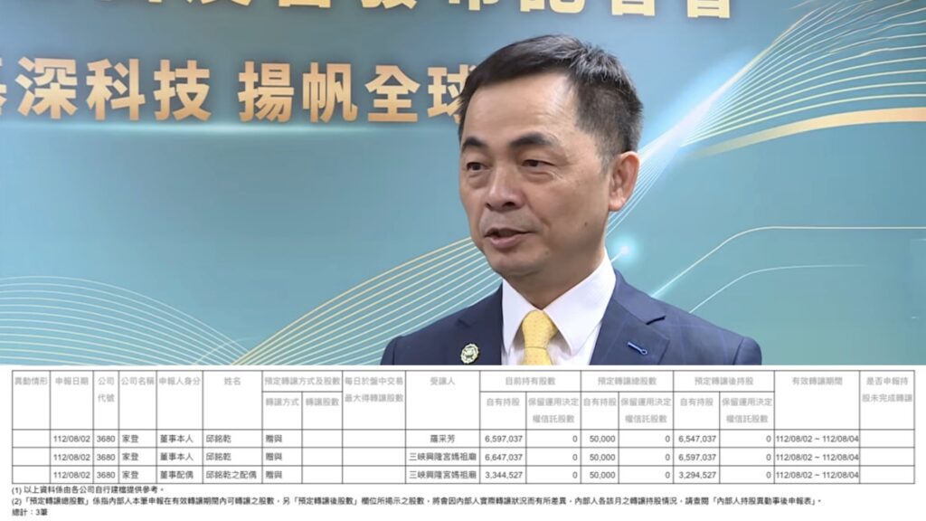 截至封關日,家登股價來到392.5元,這份「神級大禮」市值高達3,925萬元。在公開資訊觀測站,2023年8月邱銘乾以夫妻名義讓與股票,並以已故雙親及岳父母的名義捐贈正在改建的三峽媽祖。