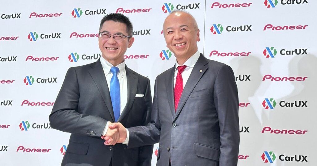 CarUX併Pioneer後將執行3個百日計畫。左起CarUX董事長洪進揚、Pioneer社長矢原史朗。(群創提供)
