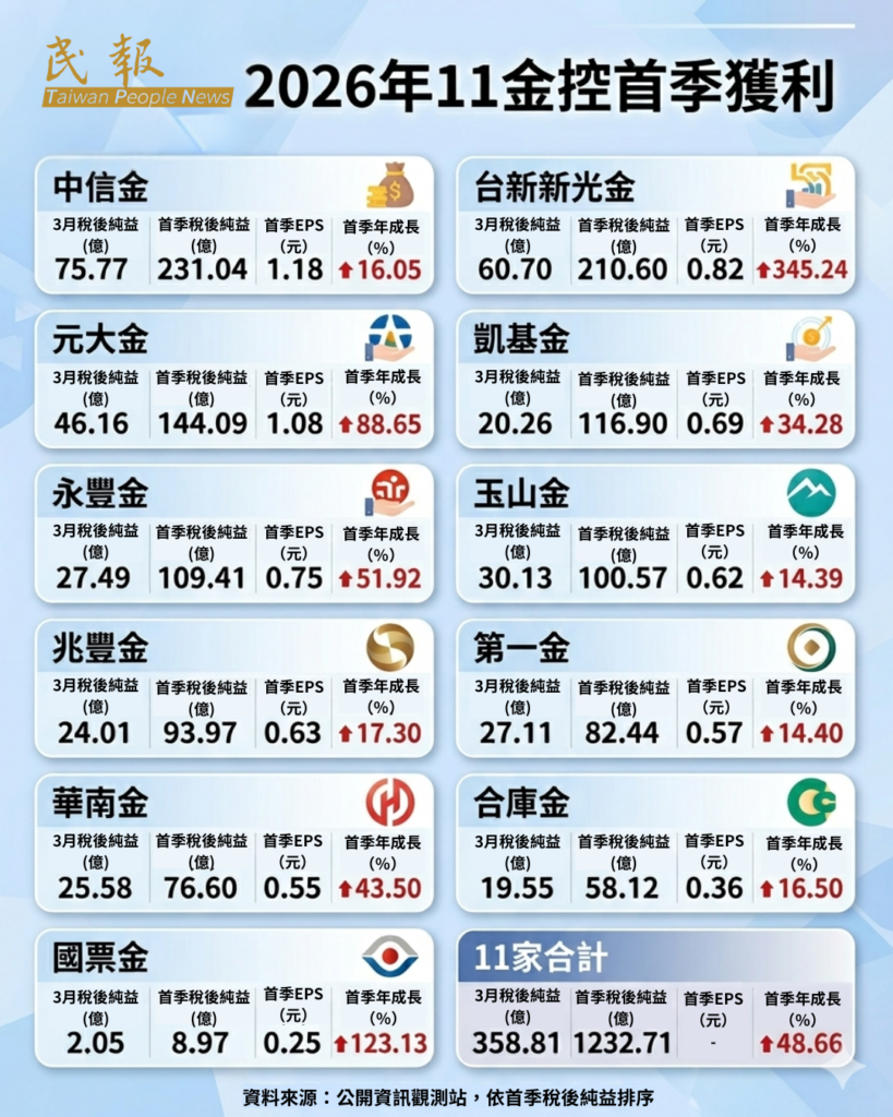 整體表現方面,11家上市金控今年第一季合計獲利達1232.71億元,較去(2025)年同期829.22億元大幅成長約48%,顯示金融業獲利動能明顯回溫,整體營運表現優於市場預期。