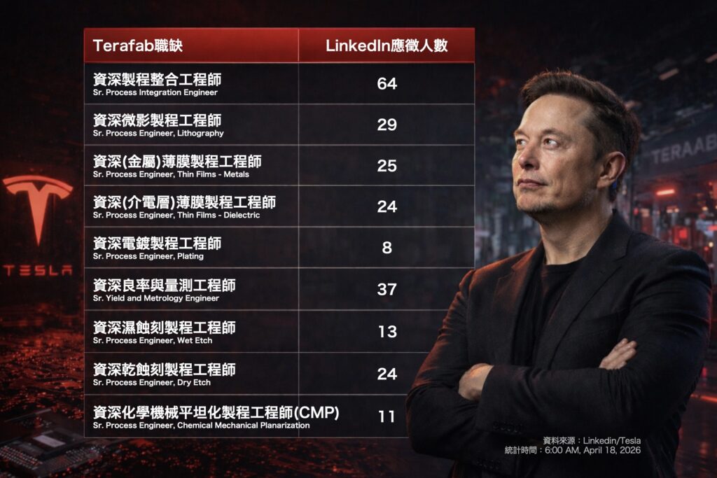 特斯拉(Tesla)執行長馬斯克(Elon Musk)放話要蓋AI晶片廠「Terafab」,人還沒到、廠還沒蓋,台灣工程師已經先動了。從特斯拉的LinkedIn數據來看,自3月24日首波釋出職缺以來,已吸引235人投履歷,其中一個關鍵職缺更擠進64人搶位,已觸動台灣半導體最敏感的神經。