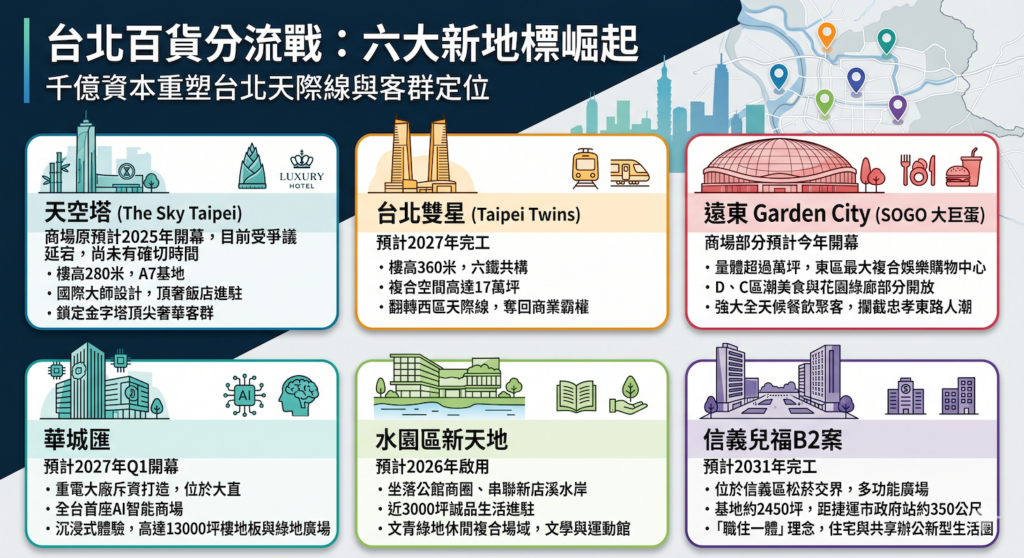 從信義區高達280公尺的「天空塔(The Sky Taipei)」、西區翻轉天際線的「台北雙星」,到東區的SOGO大巨蛋(遠東Garden City)、大直的AI智能商場「華城匯」,以及公館水岸的「水園區新天地」,未來幾年,台北市將迎來六座重量級的商場新地標。這波數十萬坪的實體空間供給震撼,宣告了台北百貨業正式進入殘酷的肉搏戰,新一輪競爭的關鍵,不再只是誰的店比較大、品牌比較多,而是誰更清楚自己要服務誰。