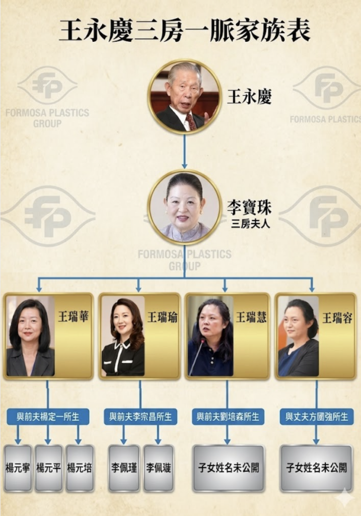 近期台塑企業管理中心常務委員王瑞瑜愛女,登上歐洲政經大會為集團開展海外版圖,外界也不免好奇,台塑創辦人王永慶三房(李寶珠)一脈的其他第三代成員,如今有著什麼樣的發展?相較於第二代王瑞華、王瑞慧等人早早扛起石化與長庚醫療版圖的重任,這群第三代成員展現了更加多元的生涯發展。