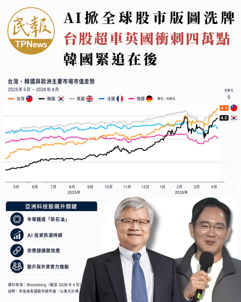 在人工智慧(AI)投資熱潮的驅動下,全球股市市值版圖正經歷一場大洗牌。根據《彭博》報導,憑藉著在AI硬體供應鏈中無可取代的寡占優勢,科技島國台灣與韓國正逐一超越歐洲傳統經濟大國。