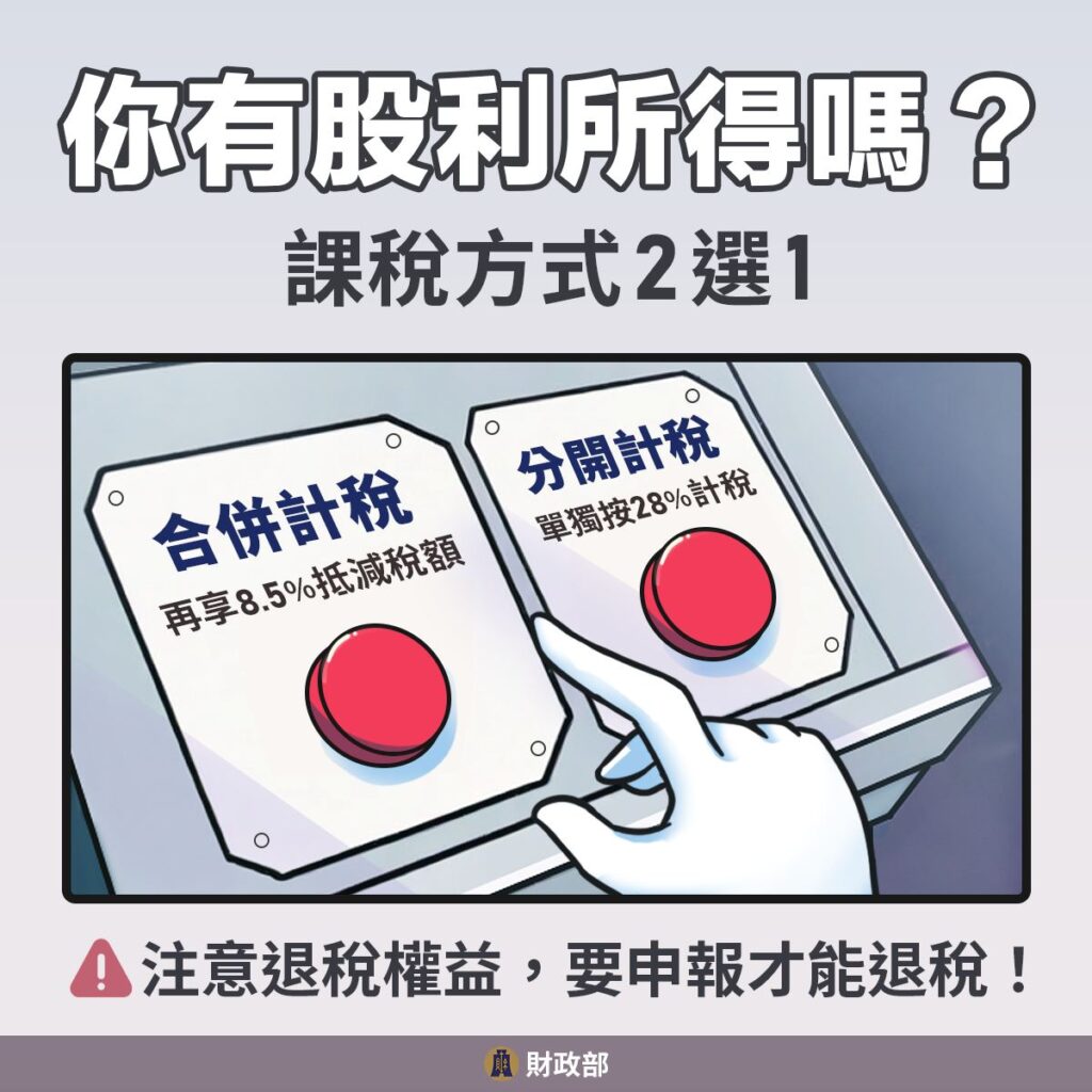 在課稅方式上,股利所得分成「合併計稅」與「分離課稅」二種制度,投資人可依自身所得結構與稅率級距,選擇較有利的方式進行報稅。