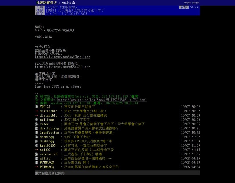 有股民在網路論壇PTT上詢問,「國際金價不斷創新高,即將突破4000美元,而元大黃金反1則不斷創新低,金價再漲下去,元大S&P黃金反1有沒有可能像元大S&P原油正2ETF那樣慘遭下市呢?」引發網友討論。