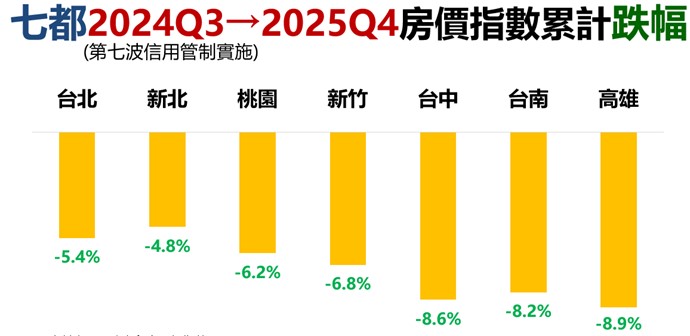 永慶房屋在耶誕節前舉行2026年第一季房屋趨勢前瞻報告,央行去年第三季實施第七波信用管制以來,房價下跌不到9%,雙北、桃園房價下跌幅度最小,台中、高雄跌幅相對明顯,但也不到9%,葉凌棋說,由於和民眾預期跌幅小,使得房市急速量縮。