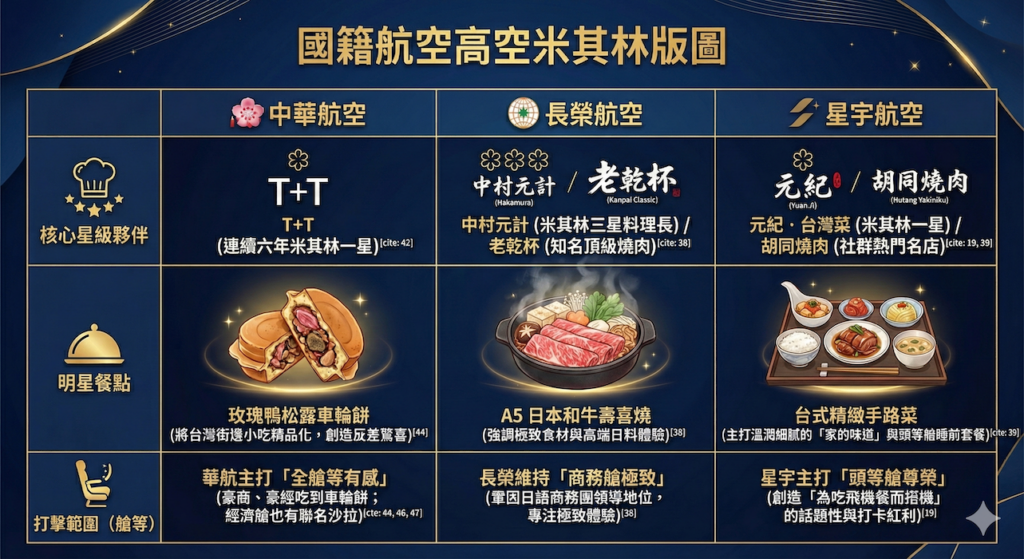 面對華航的猛攻,長榮航空與星宇航空早已各據山頭。長榮航空憑藉著與米其林三星料理長中村元計(NAKAMURA)多年的穩固合作,牢牢抓住高端日料市場;同時採取「極致肉食」與「名店聯名」雙軌策略,除了引進A5日本和牛壽喜燒,也與「老乾杯」等知名品牌合作,將地面上的高人氣品牌直接平移至機艙。