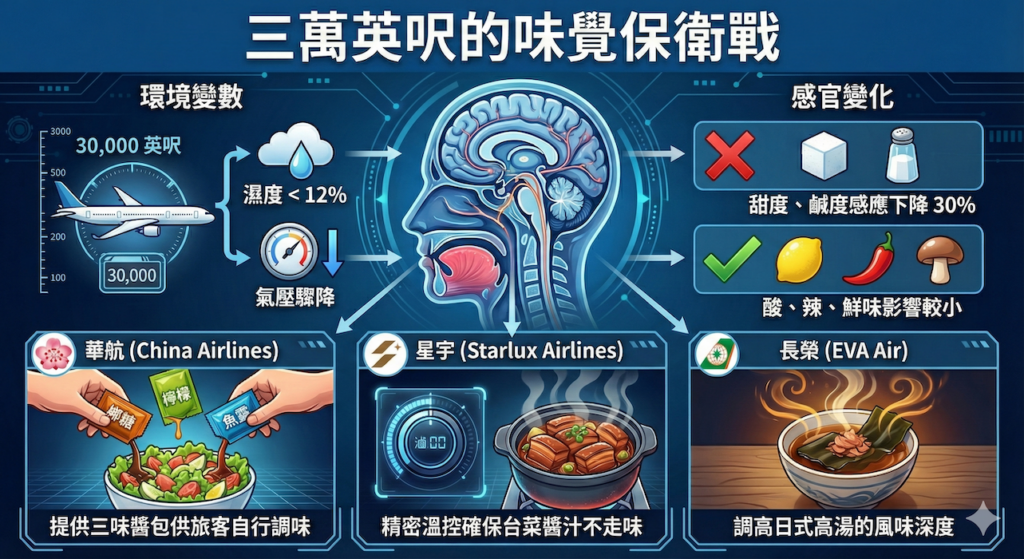 當你在豪華商務艙內,優雅地切開由米其林一星主廚設計的「玫瑰鴨松露車輪餅」時,這背後實則是一場跨越物理限制的技術馬拉松,要把地表的Fine Dining精髓搬上飛機,航空公司面臨的首要敵人,是三萬英呎高空驟降約30%的味覺靈敏度,以及機艙內極度乾燥、氣壓低於海平面的嚴苛環境。