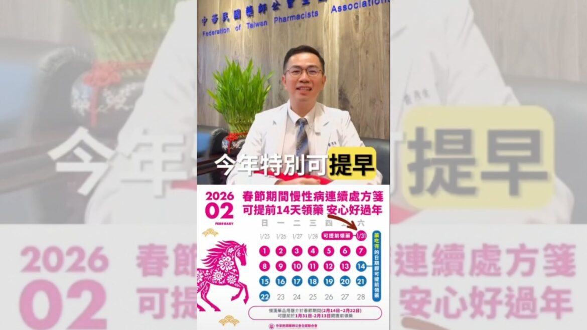 藥師公會全聯會發言人黃彥儒表示,春節前最常被民眾詢問的問題就是領藥時間的判斷。其實民眾只要掌握一個核心原則,就是檢視手中的藥品是否會在春節9天連假期間吃完。判斷基準並非僅參考慢性病連續處方箋上標註的建議領藥日期,只要確定藥品會在年節期間耗盡,民眾便可依規定在1月31日至2月13日之間,提前領取下一次的藥品備用。這項彈性措施是為了避免民眾在連假期間因找不到營業藥局,或是藥品配送不及而陷入斷藥危機。