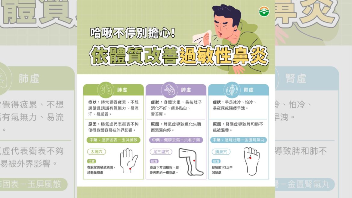 每逢換季或春暖花開之際,許多人噴嚏打不停、流鼻水,常誤以為是感冒,實則可能是過敏性鼻炎在作祟。屏東馬光中醫診所醫師陳宇芬指出,過敏性鼻炎是鼻黏膜接觸過敏原後引發毛細血管擴張與水腫的過度反應,中醫觀點認為過敏性鼻炎雖表現於肺,但病理根源與脾、腎密切相關,臨床會針對不同體質採取補肺、益氣、固表、健脾、溫腎等方針治療,幫助患者從根本改善體質。