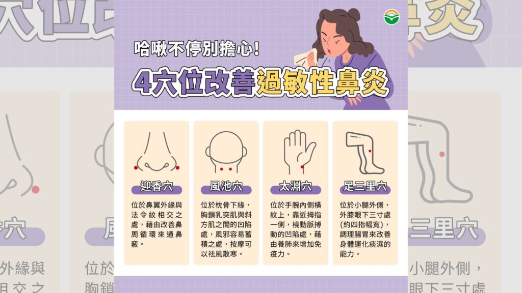 生活調整亦是抗敏關鍵,陳宇芬中醫師說,晨起建議先在被窩搓熱雙手,針對鼻翼周圍按摩後再下床活動。平時多運動能促進腎上腺素分泌使血管收縮,改善鼻塞。環境應保持清潔通風並減少粉塵塵蟎,同時確保睡眠充足、避免菸酒以維持免疫力。居家保健可按壓鼻翼旁的迎香穴通鼻竅,或按壓後腦下緣的風池穴祛風散寒。若想積極治療,可尋求中醫師進行三伏三九貼,將藥餅敷貼於背部對應穴位來溫通經絡,不僅能有效緩解過敏,更能幫助身體建立強健的防護網。
