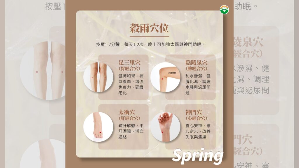 今(20)日迎節氣穀雨,馬光中醫診所徐維偵中醫師指出,穀雨作為春季最後一個節氣,象徵雨水充沛、百穀生長,此時氣溫升高且濕氣加重,是「由肝轉脾」的重要過渡期。此時火氣漸旺、濕氣漸重,若心火太旺或脾氣虛弱,容易導致身體沉重、疲倦及食慾不振等症狀。因此,穀雨養生關鍵在於「健脾祛濕、疏肝清熱」,透過茶飲與穴位按壓積極調養,能有效緩解季節性不適,為即將到來的夏季打好基礎。