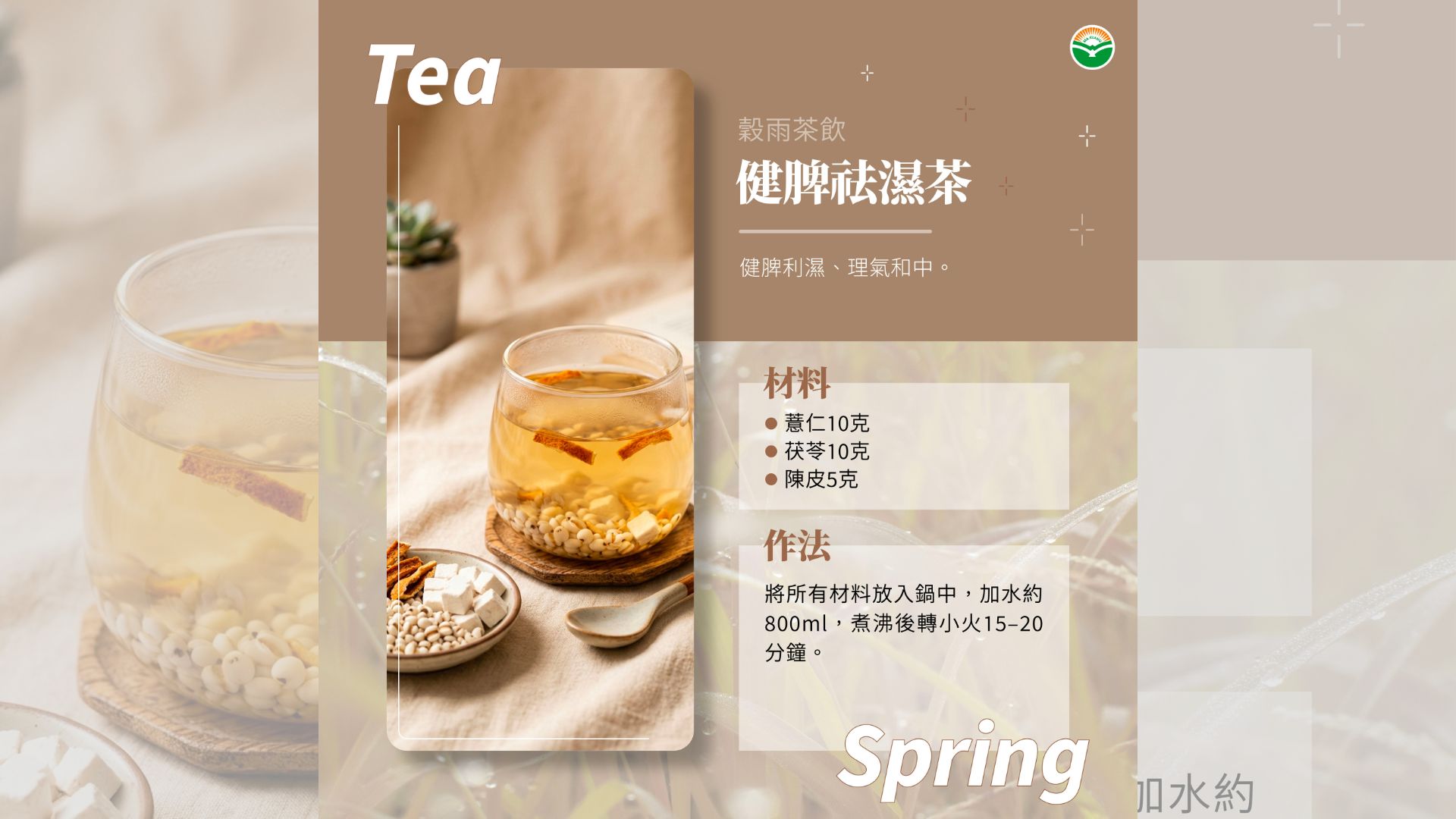 針對穀雨常見的症狀,中醫治療以「健脾祛濕、疏肝清熱」為原則。徐維偵中醫師建議,民眾可透過「健脾祛濕茶」進行日常保健,準備薏仁與茯苓各10克,搭配陳皮5克,加入約800毫升的水煮沸後轉小火熬煮15至20分鐘即可。這款茶飲具有健脾利濕、理氣和中的功效,常用藥物如白朮可健脾滲濕,柴胡、菊花能疏肝,若心火較旺則可由醫師辨證加用蓮子心或麥門冬,但藥材使用仍需視個人體質由醫師專業指導。