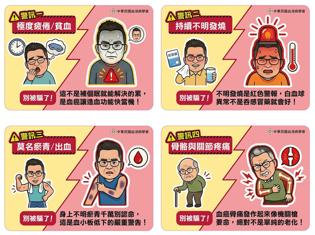 沈玉琳表示,中壯年病友常有的「四大錯認藉口」,呼籲大眾正視身體警訊。許多人會將「極度疲倦與貧血」誤以為是睡不飽,將「持續不明發燒」當成普通感冒,或將「莫名瘀青與出血」看作運動碰撞,甚至把「骨骼關節疼痛」歸咎於年紀大。