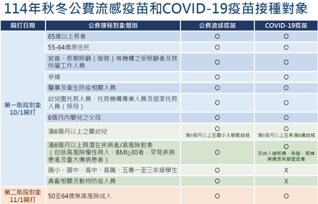 65歲以上長者、55—64歲原住民、安養、長期照顧(服務)等機構之受照顧者及所屬工作人員、孕婦、醫事及衛生防疫相關人員、幼兒園托育人員、托育機構專業人員及居家托育人員(保母)、6個月內嬰兒之父母、滿6個月以上之嬰幼兒、滿6個月以上具潛在疾病者/高風險對象(包括高風險慢性病人、BMI≧30者、罕病及重大傷病患者)、國小、國中、高中、高職、五專一至三年級學生、食畜相關及動物防疫人員。