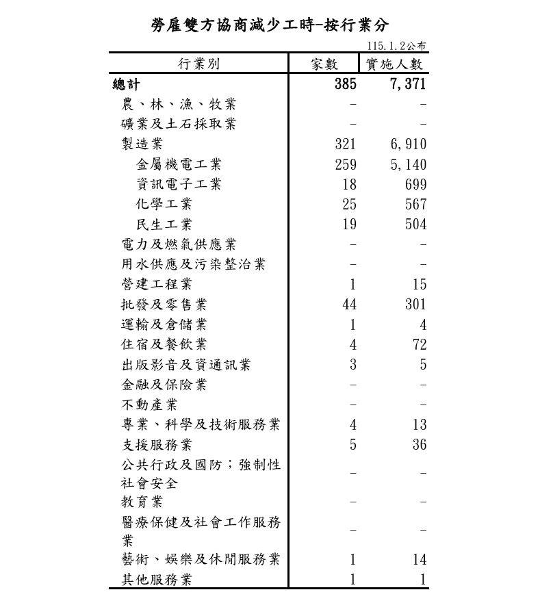 勞動部今(2)日公布從2025年12月16日統計至今,因應景氣影響勞雇雙方協商減班休息(無薪假)的事業單位,共計385家、人數共7371人,相較於上期增加7家、253人。這次減班休息實施的主要行業,仍以製造業中的金屬機電工業居多,規模以小型事業為主。