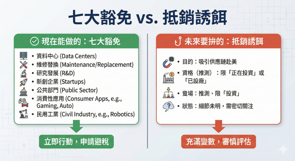 即便產品規格與稅號皆符合課稅要件,資誠強調,行政命令中仍預留了寬廣的「豁免空間」。根據資誠彙整的資料,只要進口用途符合下列七種情形之一,即可豁免加徵25%關稅,包括:供美國境內資料中心使用、在美國境內作維修或替換用途、供美國境內研究發展使用、供美國境內新創企業使用、以及供美國公共部門使用。