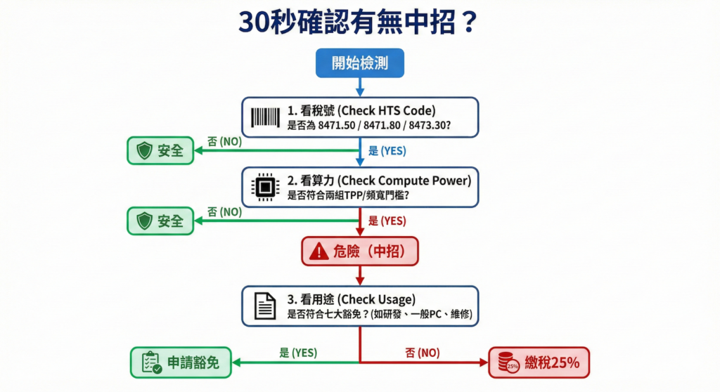 除了硬體效能外,產品的海關稅則號別(HTSUS)也是判定的另一大要件。資誠分析,上述半導體產品必須同時落入特定的稅則84分類章節,才算符合課稅範圍,這些稅號包括:8471.50(包含資料處理功能的機器,例如含AI加速卡的運算伺服系統)、8471.80(其他自動資料處理設備,可含特殊AI伺服器或運算模組),以及8473.30(自動資料處理機器的零組件)。換言之,只有具備極高階AI運算能力,且申報為上述特定稅號的產品,才是美方此次鎖定的目標。