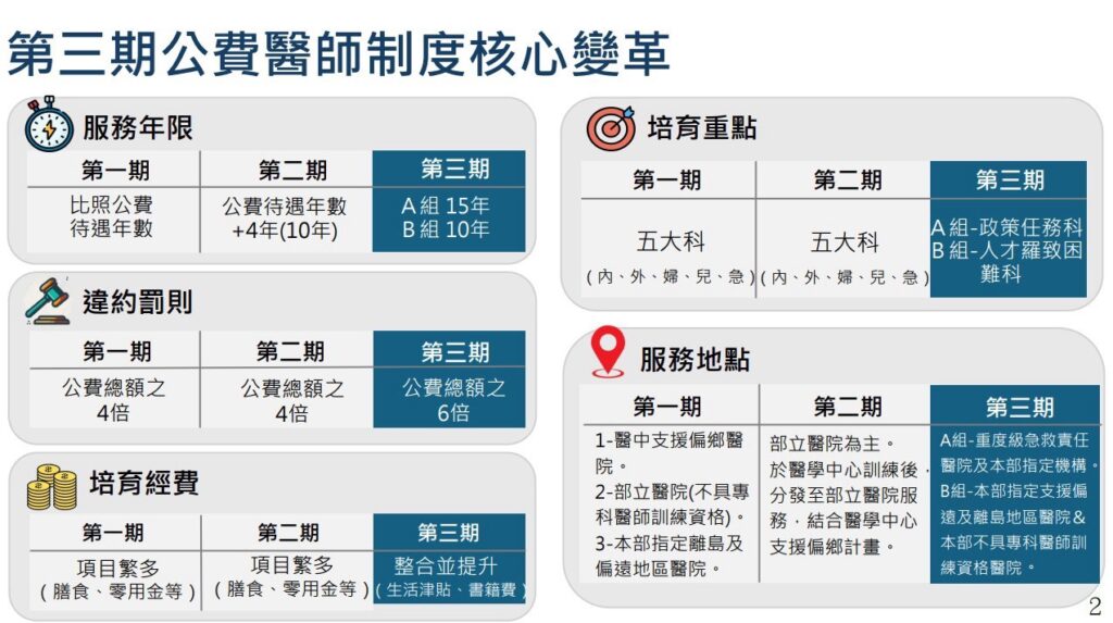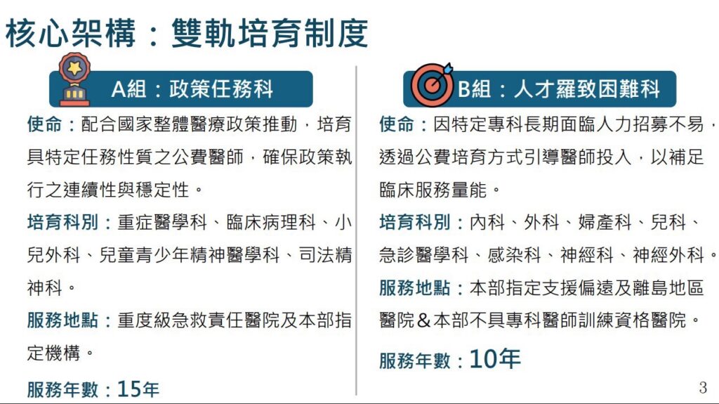 卓琍萍表示,第三期計畫擬將公費生分為兩類,「人才羅致困難科別」:如內、外、婦、兒、急診等五大科,維持綁約10年;「政策任務科別」:包含重症醫學科、臨床病理科、小兒外科、兒童青少年精神醫學專科、司法精神科。考量這些科別具高度特定性且缺口大,擬要求綁約15年以確保政策推動的持續性與穩定性。
