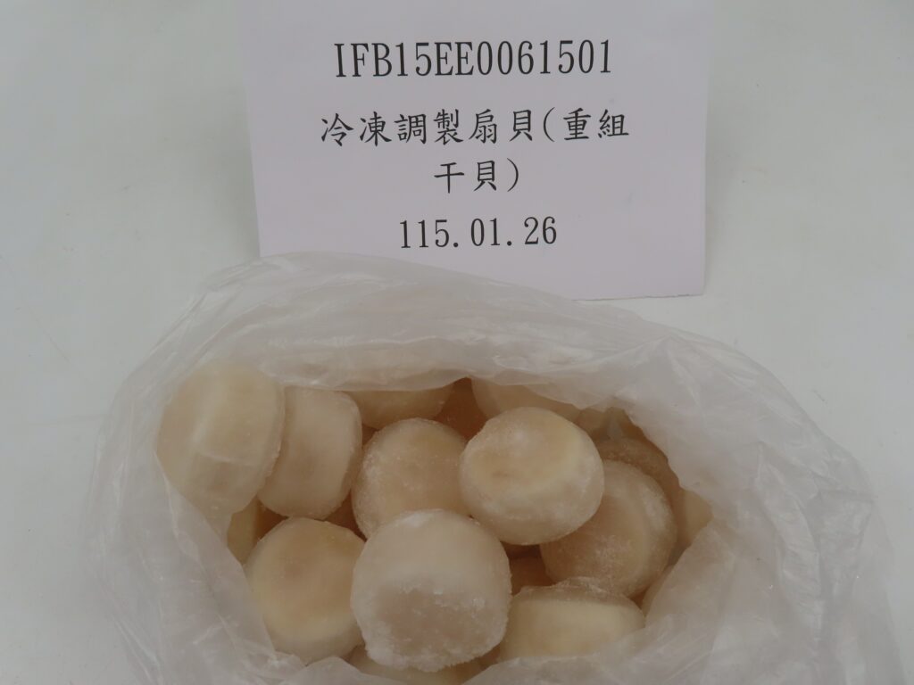 中國大陸出口「冷凍調製扇貝(FROZEN SCALLOP )」檢出其他衛生項目不符規定。(食藥署提供)