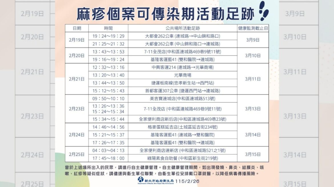 新北市衛生局於今(26)日接獲麻疹確診通報,個案為一名設籍中和區的42歲男性。經調查發現,該名個案為先前境外移入確診個案之接觸者,於監測期間的2月19日開始出現咳嗽與發燒症狀,23日進一步出現紅疹,24日經醫院通報後正式確診。目前個案狀況穩定,正於家中進行隔離治療。衛生局針對此案已緊急匡列包括5名同住親友在內,共計526名接觸者,並將持續監測其健康狀況至3月17日。