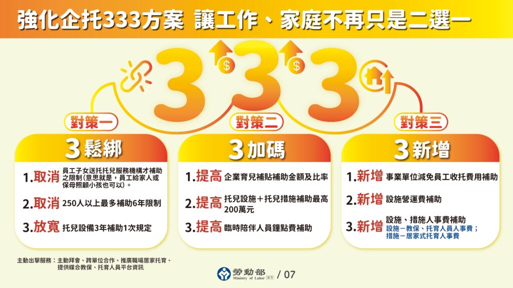 為了支持勞工兼顧工作與家庭,勞動部4日推出「企托333政府來幫忙」企業托育補助新制,預計擴大補助企業設置托育設施與措施,新制預計5月1日正式上路。