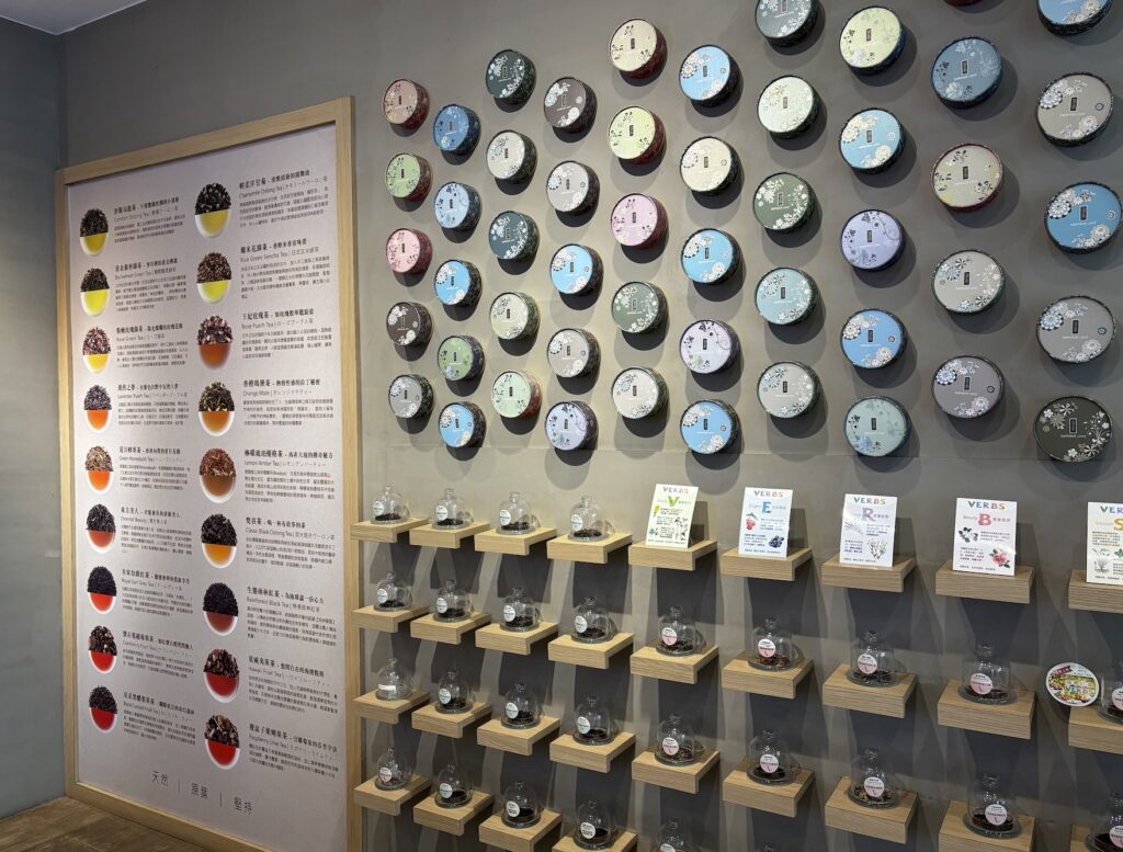 詹晋嘉在門市特別設置一面牆,擺上不同種類的茶葉,讓民眾能進一步了解各種茶葉的特色。(圖/記者李孟璇攝)