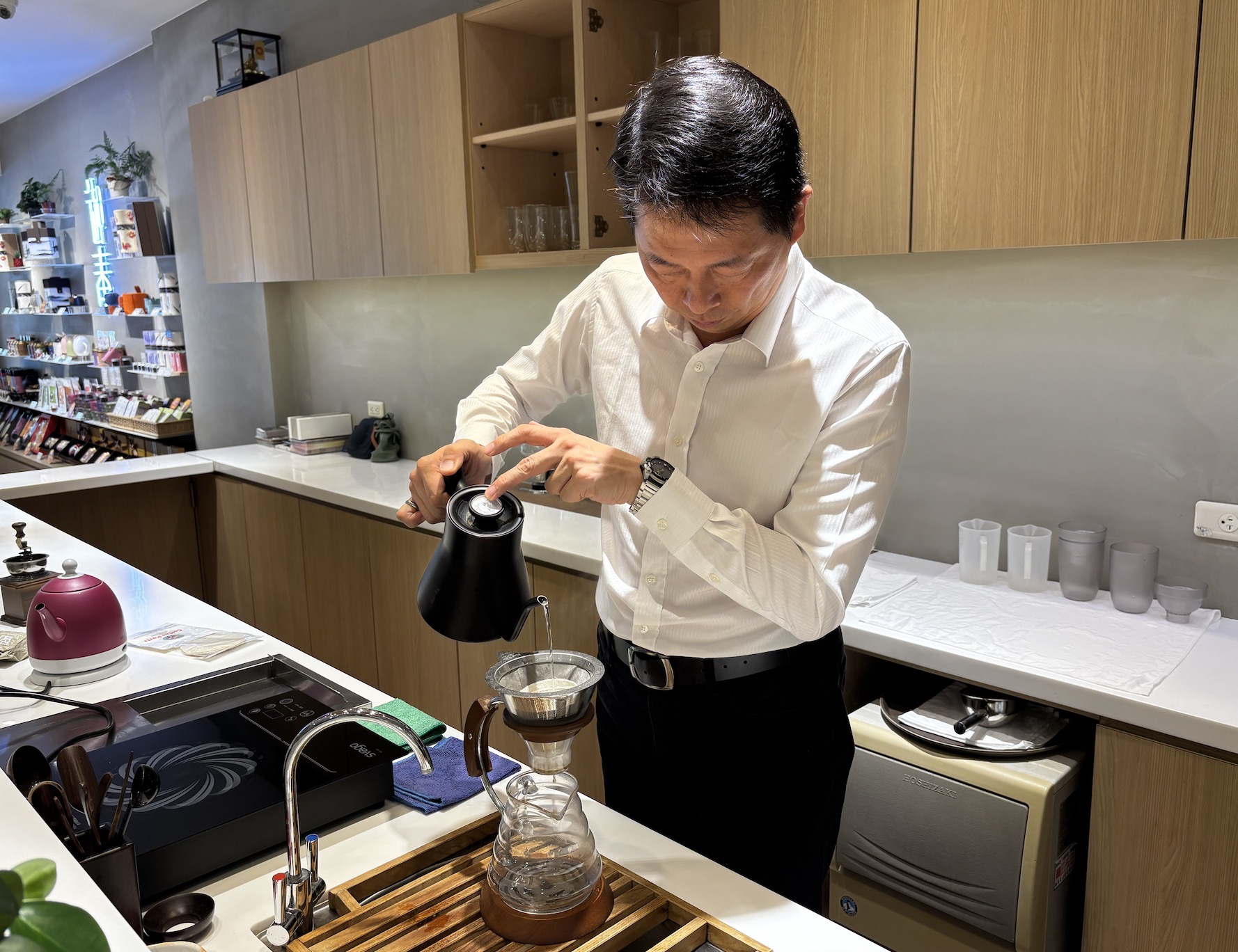 詹晋嘉說自己是咖啡愛好者,幾年前因攝取過量導致咖啡因中毒,「從那之後,我開始改喝茶,有一天靈機一動,把手邊的咖啡器具拿來泡茶,沒想到意外喝到新的風味。」