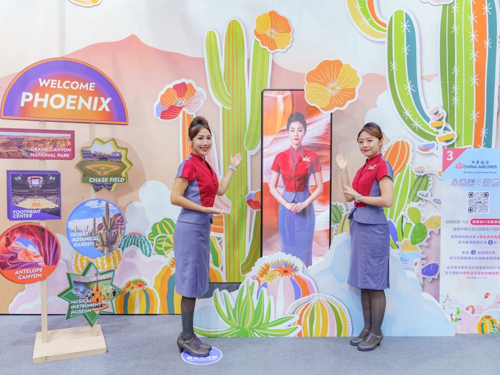 華航展區以年度品牌主軸「Fly Beyond Boundaries」為設計概念,採懸空吊掛與立體插畫風格,象徵航向新開航的鳳凰城及北美航網拓展。現場最大亮點為AI品牌形象大使登場,旅客可透過互動螢幕與AI客服對話,體驗智慧航空服務,並探索鳳凰城的旅遊魅力。
