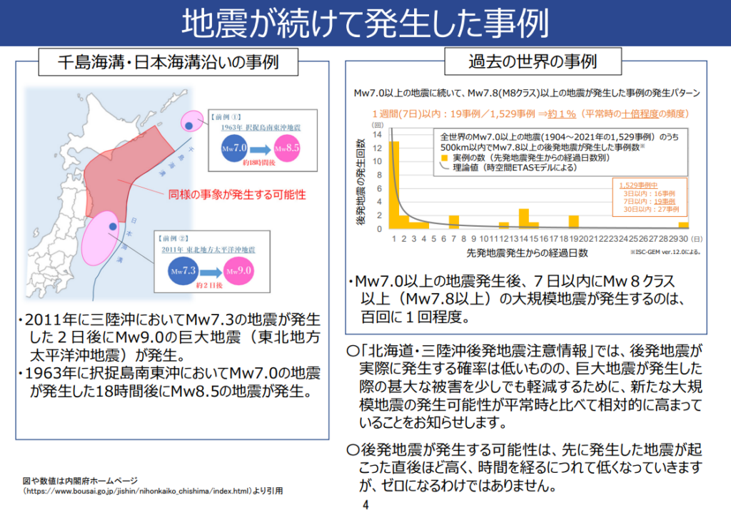 雖然機率不高,但過去已有類似案例,例如2011年東日本大震災規模9.0發生前兩天,即發生過規模7.3的地震。此外,根據中央防災會議評估,該地區發生最大級別海嘯的300至400年週期已接近,面臨大規模海嘯的風險相對提升。