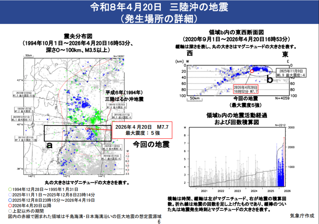 由於本次地震的地震矩規模(Mw)高達7.4,確認已對「千島海溝與日本海溝」的潛在巨大地震震源區造成影響,達到國家警戒基準。日本氣象廳於晚間19時30分召開記者會,發布自去(2025)年12月以來的首次「北海道和三陸近海後發地震提醒資訊」。警戒對象涵蓋北海道至關東地區共7縣、182個市町村。