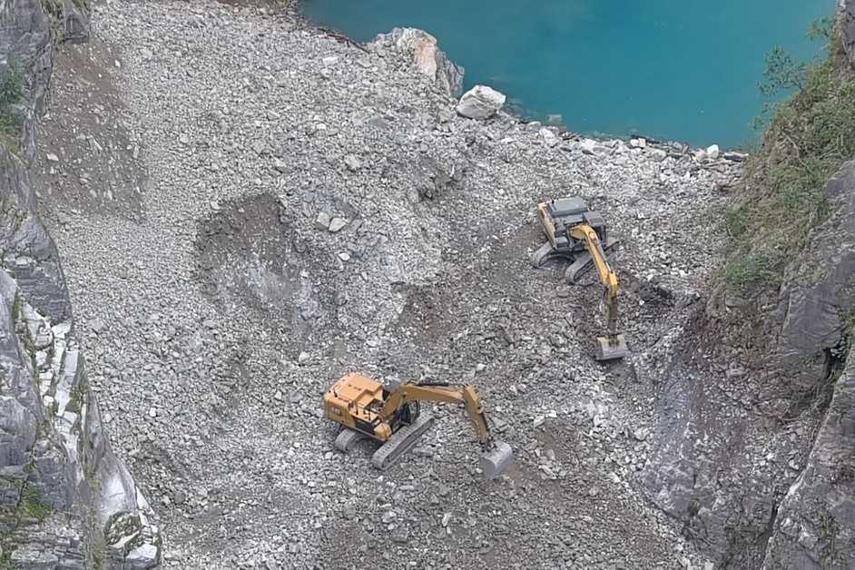 立霧溪燕子口堰塞湖減災工程已進入關鍵階段!林業及自然保育署表示,工程團隊在完成大部分上邊坡刷坡與壩體施工便道開闢後,於昨日(25日)已針對堰塞湖壩體降挖近2公尺。今日將壩體深槽線開挖,引流湖水以降低水位及蓄水量。