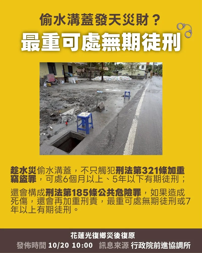 他強調,偷竊溝蓋板,趁機發災難財,是非常嚴重的觸法行為,依刑法第321條可處6個月以上、5年以下有期徒刑,若造成公共危險或人員死傷,可依刑法第185條論處,最重可判無期徒刑。